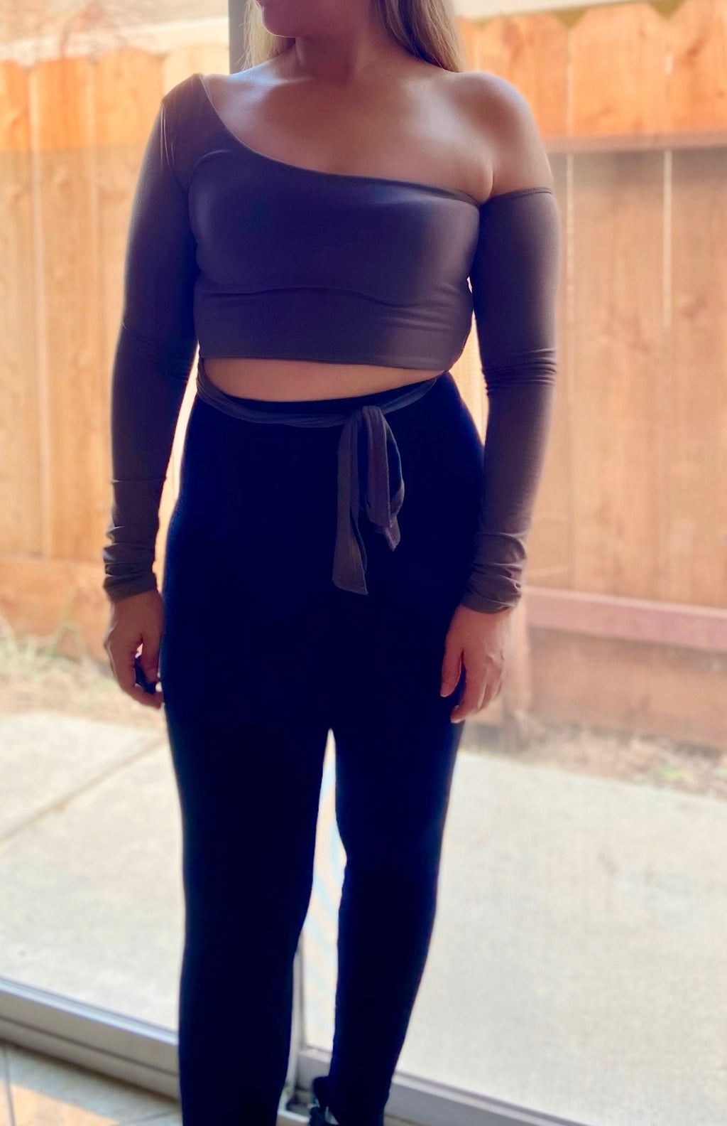 The Liana Top is a Long Sleeve One Shoulder Crop that you must have. Wear with care as one of the sleeves is stitched very delicately. The fabric is super soft and nice flattering style. It has a tie that can be t...
