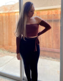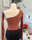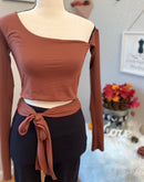 The Liana Top is a Long Sleeve One Shoulder Crop that you must have. Wear with care as one of the sleeves is stitched very delicately. The fabric is super soft and nice flattering style. It has a tie that can be tied to the front or the back. It’s a cute Top to be paired with your favorite high waist jeans. Make it a look.
