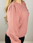 This Sweater is a Puff Sleeve round neck pullover sweater. Its a super soft sweater and the color is so pretty. We love the detail of the Puff Sleeve which gives it great style. Dress this up and wear with all your favorite bottoms.