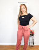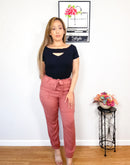 High raise Paper bag rayon twill pants with 2 front pockets are perfect for the spring time. The paper bag waist is very flattering and easy to pair with a tank or crop They have an ankle elastic and the lightweight material is so comfortable. Elastic waistband, fits true to size of looking for a loose fit I recommend to size up.