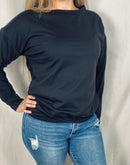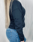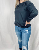 Simple Black Sweatshirt with banded bottom detail. It’s a round-neck pullover Sweatshirt. Easy cute look for the day. It’s beyond comfy and lightweight for lounging around the house or wear with your favorite Jeans and make it an OOTD. A must have for fall and winter.