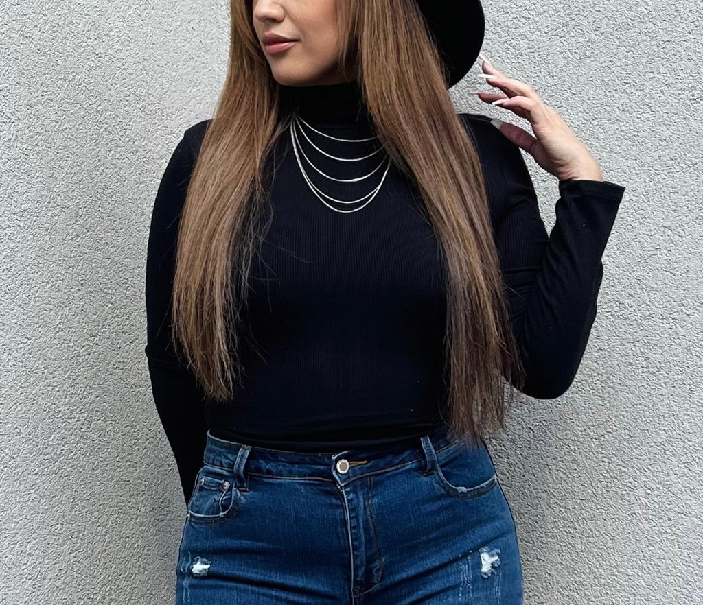 Knit fitted casual style ribbed long sleeve turtleneck. Solid black that you can pair with all your favorite fall looks. Great for layering and a must have fall piece.